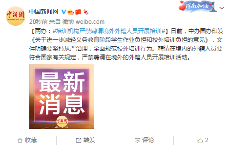 原标题:两办:培训机构严禁聘请境外外籍人员开展培训 日前,中办国办印发《关于进一步减轻义务教育阶段学生作业负担和校外培训负担的意见》,文件明确要坚持从严治理,全面规范校外培训行为。聘请在境内的外籍人员要符合国家有关规定,严禁聘请在境外的外籍人员开展培训活动。