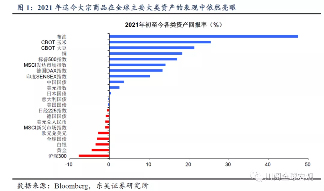 原标题:过去50年来涨势最猛的大宗商品牛市,都有这个特征 来源:川阅全球宏观 本文来源于川阅全球宏观 隔夜大宗商品大涨,尤其是原油暴力拉升5%,黄金也重回1800美元。这使得自7月以来的一波大宗商品下跌有筑底反弹的迹象。 而尽管此前遭遇回调,大宗商品依然是2021年迄今全球表现最好的资产。从当前来看
