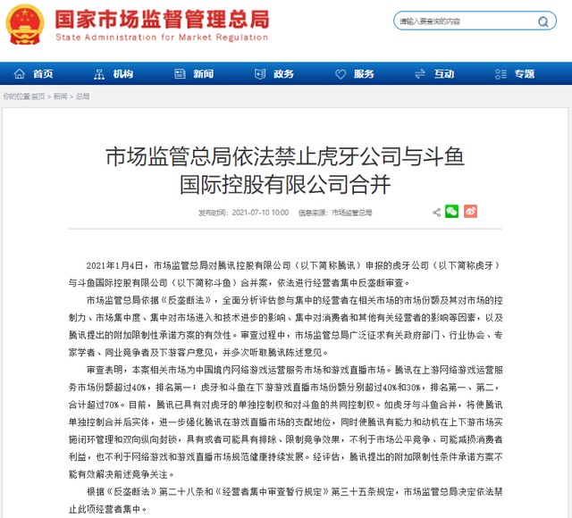 原标题:又一重大反垄断案件!虎牙斗鱼合并被紧急叫停 释放什么信号? 7月10日上午,国家市场监督管理总局发文表示,依法禁止虎牙公司与斗鱼国际控股有限公司合并。 2021年1月4日,市场监