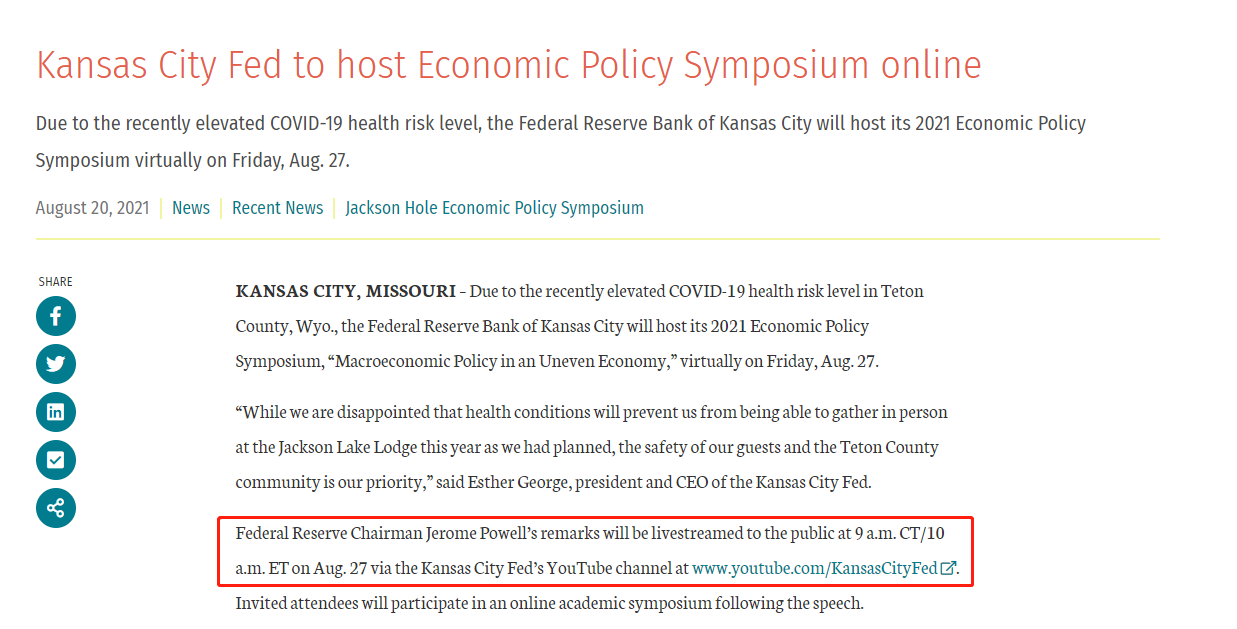 原标题:杰克森霍尔央行年会再度线上举行 FED主席演讲最吸睛 原标题:财联社 美国堪萨斯城联邦储备银行周五表示,由于当地疫情风险提高,将于下周举行的年度经济研讨会不得不再次在线上举行。而预定于北京时间周五晚上10点进行的美联储主席鲍威尔的演讲,将是这次央行年会最大关注点。 堪萨斯联储举办的年度会议,