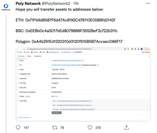 来源:华尔街见闻 Poly Network宣布遭黑客入侵,30多分钟内价值超6.1亿美元的资产被洗劫一空。但该盗窃事件周三迎来转机:目前已有超过480万美元的资金返还。有分析称,这表明即使能偷走加密资产,洗钱和套现也非常困难。 周二,Poly Network宣布遭黑客入侵,30多分钟内价值超6.1