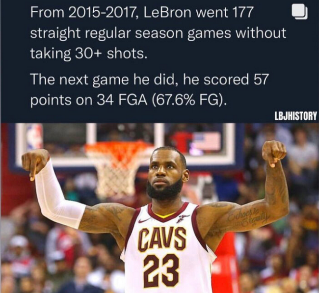 北京时间8月22日,勒布朗-詹姆斯在个人社交媒体发文,他要让黑子们知道,如果想砍分的话,他随时可以。 詹姆斯发出一张自己的图,上面配上一些数据。 从2015-2017赛季,詹姆斯曾连续177场常规赛出手不到30次。 接下来一场他做到了,砍下了57分,投篮34次,投篮命中率为67.6%。 詹姆斯还加上