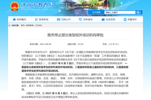 我市停止部分类型校外培训机构审批 根据中共中央办公厅、国务院办公厅《关于进一步减轻义务教育阶段学生作业负担和校外培训负担的意见》(以下简称《意见》)和山东省教育厅《关于迅速推动“双减”工作落实的通知》要求,济南市教育局、济南市行政审批服务局联合发布《关于停止部分类型校外培训机构审批业务的通知》(以下