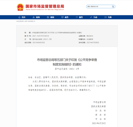 市场监管总局等五部门关于印发《公平竞争审查制度实施细则》的通知 国市监反垄规〔2021〕2号 各省、自治区、直辖市人民政府,国务院各部委、各直属机构: 为深入贯彻党中央、国务院决策部署,全面落实公平竞争审查制度,市场监管总局、国家发展改革委、财政部、商务部、司法部会同有关部门修订了《公平竞争审查制度