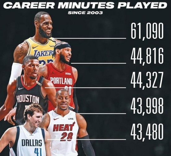 北京时间8月31日,据美媒统计,2003年至今球员出场时间排名的前五位,洛杉矶湖人的詹姆斯和安东尼高居前二,疯狂的是,詹姆斯比安东尼高出16000+分钟,具体情况如下: 1、詹姆斯,61090分钟; 2、安东尼,44816分钟; 3、乔-约翰逊,44327分钟; 4、伊戈达拉,43998分钟; 5、