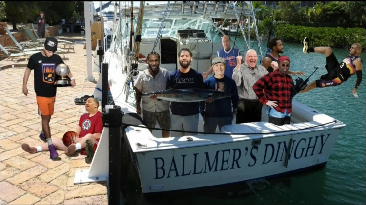 直播吧7月2日讯 昨日太阳4-2淘汰快船晋级总决赛,贝弗利在最后情绪失控怒推保罗。TNT在今日直播间恶搞了这个情景,在鲍尔默的钓鱼小艇中,贝弗利将保罗退出船外,而岸上也同样精彩,抱着西部冠军奖杯的布克则跨过了坐在地上的泰伦-卢。【来源:直播吧】