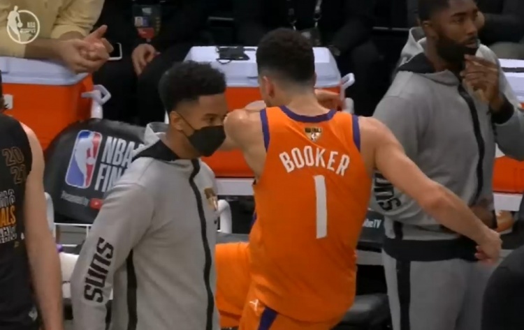 直播吧7月15日讯 总决赛G4,太阳vs雄鹿,在末节还剩10分50秒时布克吃到本场个人第五犯,下场休息。布克下场时不禁怒踢场边的椅子。【GIF】布克的第5犯!【GIF】布克大怒踢椅子(Sera)【来源:直播吧】