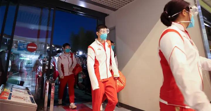 7月17日,中国乒乓球队成员马龙(右二)抵达东京成田机场。新华社记者曹灿摄 国乒队长马龙紧了紧护目镜和N95口罩,推着行李车走出日本成田机场T1航站楼。他的粉丝在距他两米开外(注:东京奥运会规定安全距离是两米)的地方大声喊着他的名字。 女足队员王霜压低了面罩,推着行李车的她戴着手套,看见记者没有说话