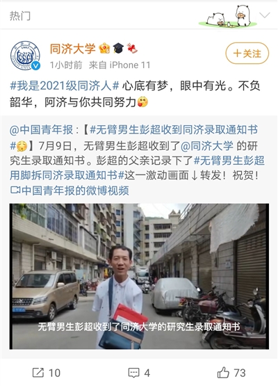 他6岁时被高压电所伤,失去双臂,在父母帮助下开始练习用脚做事。2015年被四川大学法学院录取。大学期间,他参加了《中国诗词大会》,还荣获“全国自强模范”称号……你还记得四川无臂青年彭超吗? 今年3月27日,彭超参加同济大学法学院研究生复试,用脚完成了3个多小时的考试,他的励志视频再次被网络关注。 7