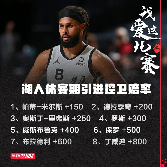 北京时间7月23日,美国博彩网站开出了湖人队在今年夏天将引进的控卫赔率,马刺队的澳大利亚控卫帕蒂-米尔斯排名第一。 近日有报道称,湖人队希望在今年休赛期补强一号位,而且他们的目标对准了克里斯-保罗和威少。 对此,美国博彩网站开出了湖人队在今年夏天将引进的控卫赔率,马刺队的澳大利亚控卫帕蒂-米尔斯排名