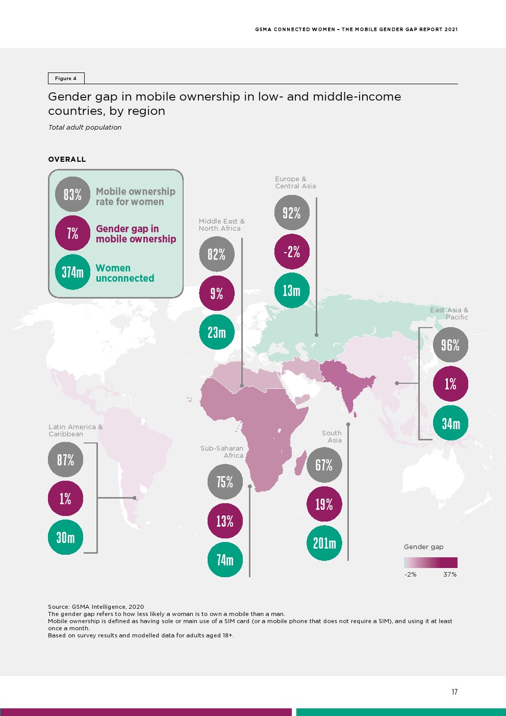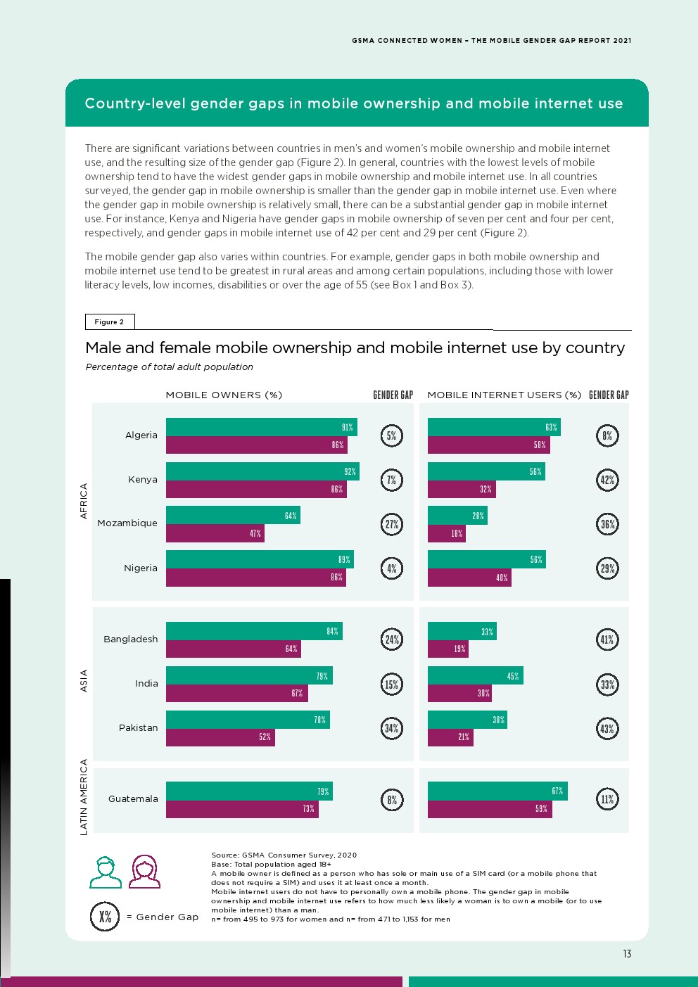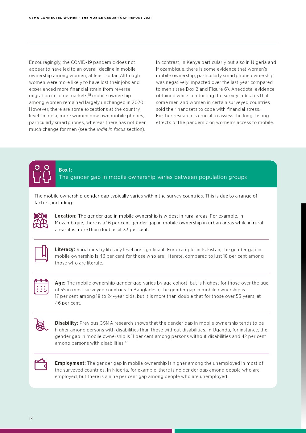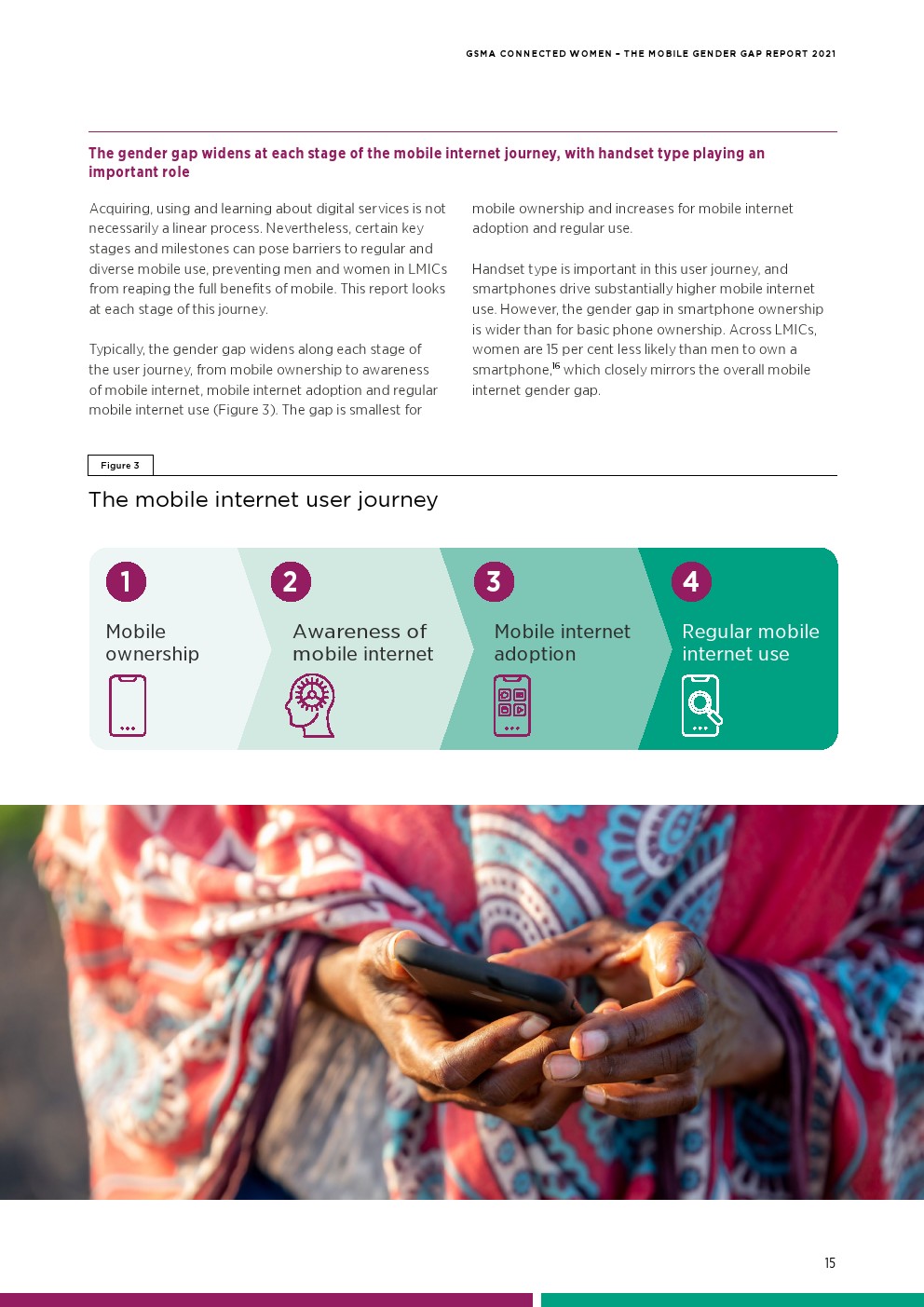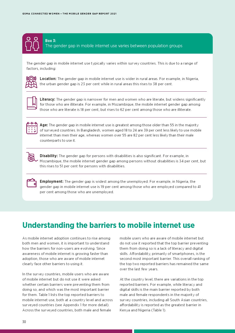 负担能力、识字能力和数字技能的缺乏以及对移动互联网的认知度是女性面临的关键和常见障碍。社会结构性不平等和歧视性社会规范也是一个挑战。即使女性的教育、收入、文化程度和就业水平与男子相同,她们拥有手机或使用移动互联网的可能性仍然较小。