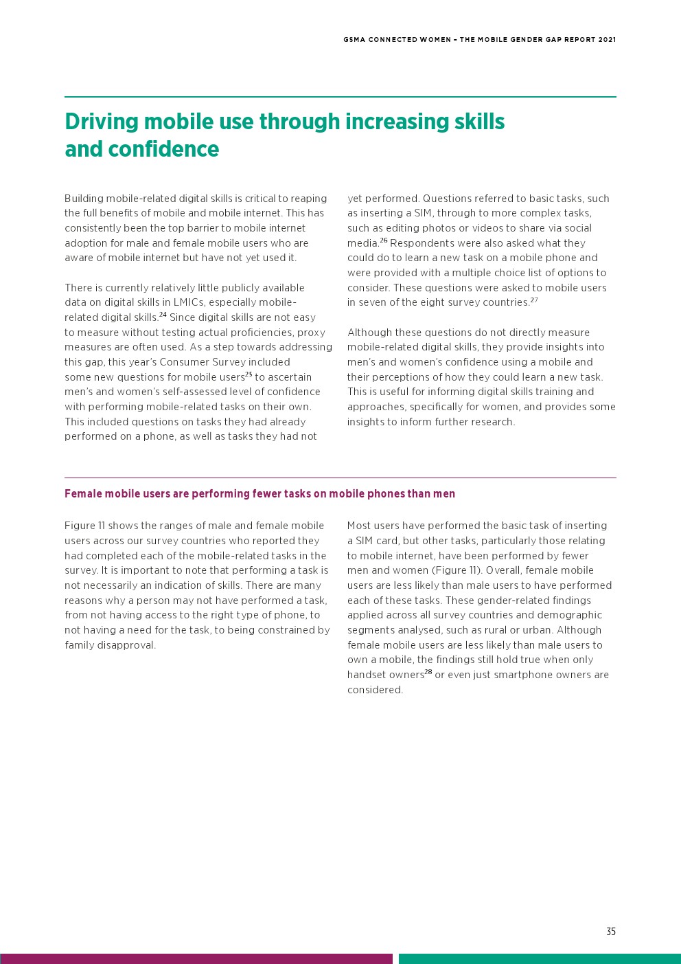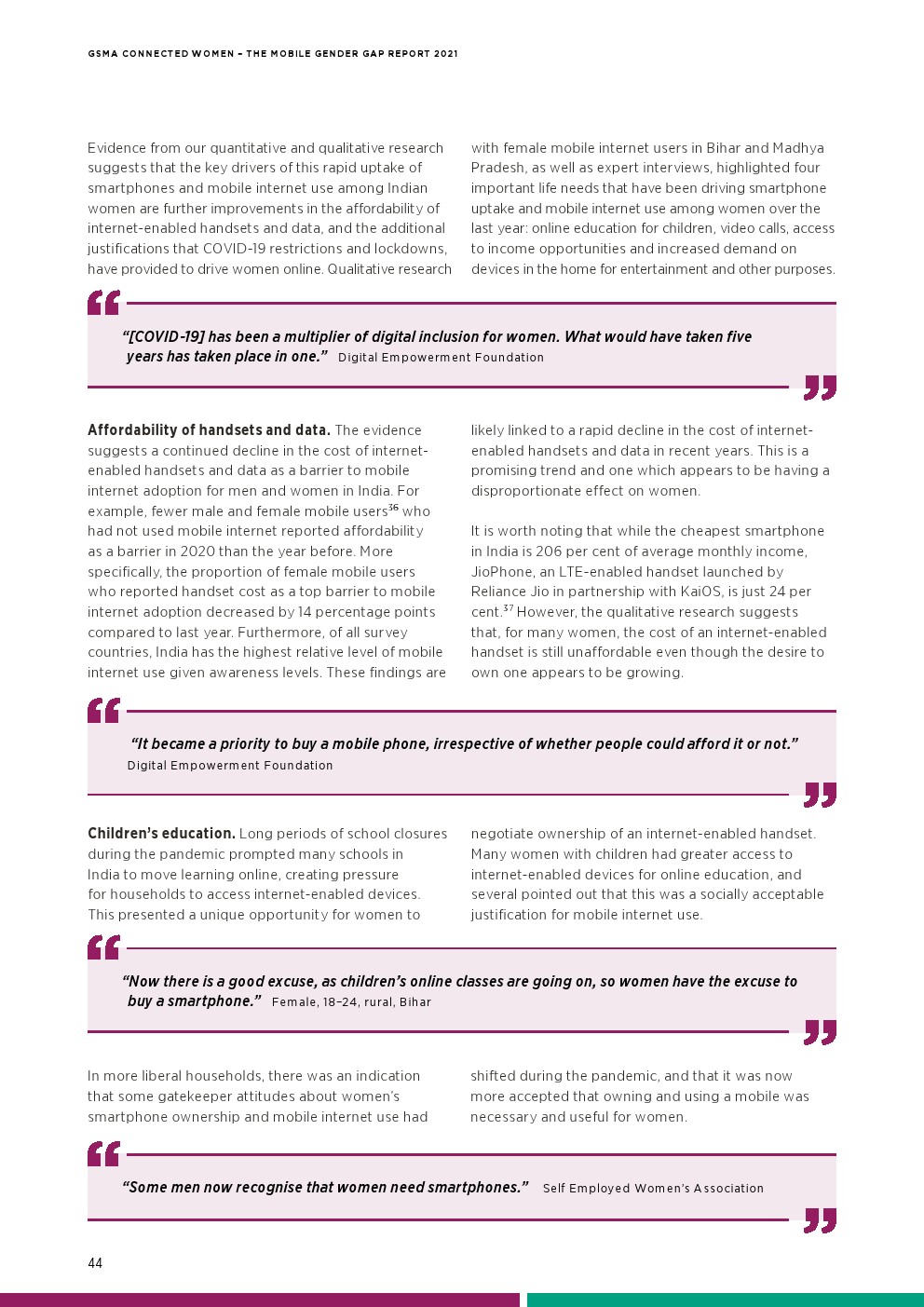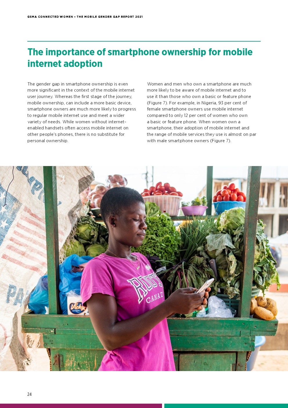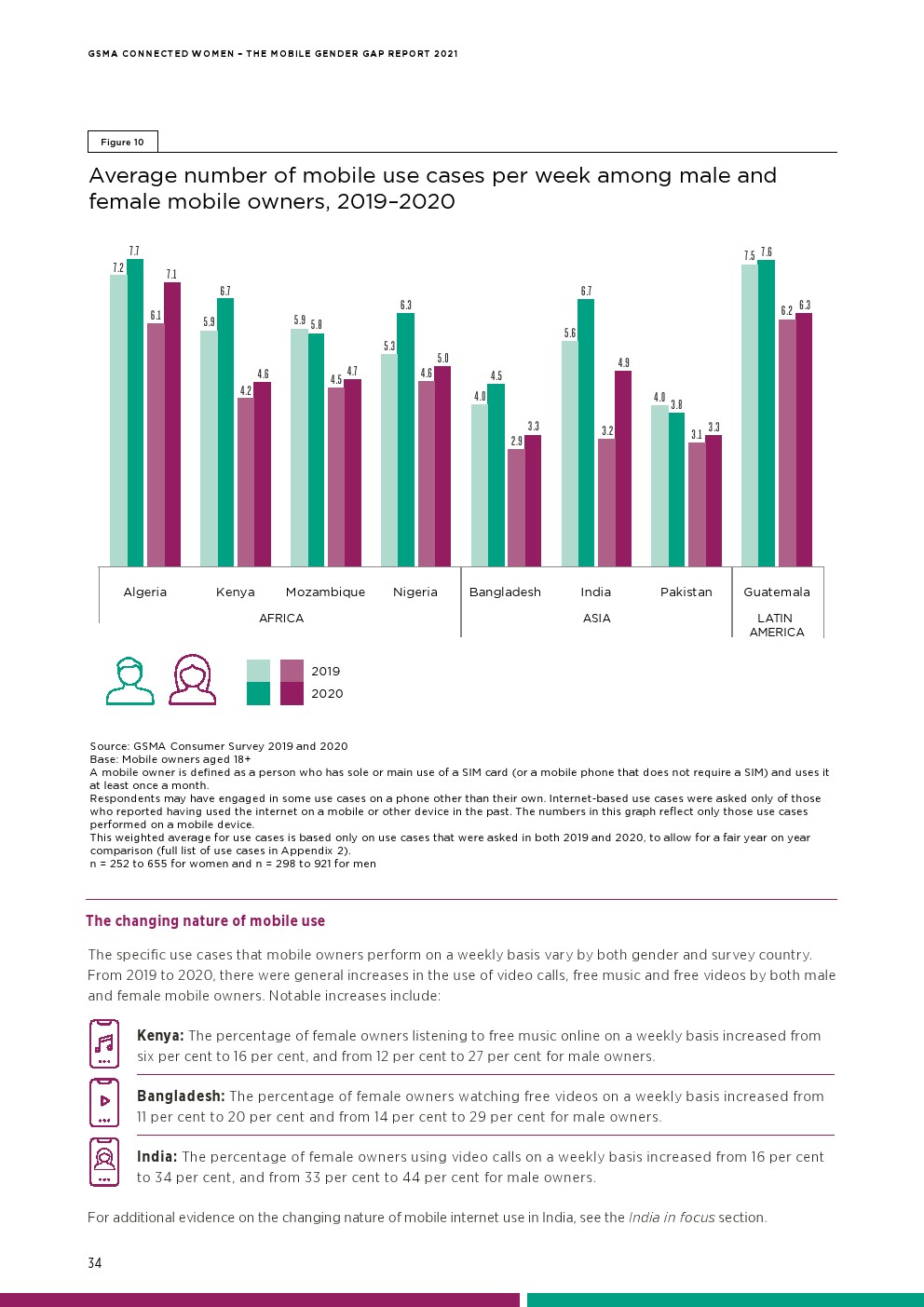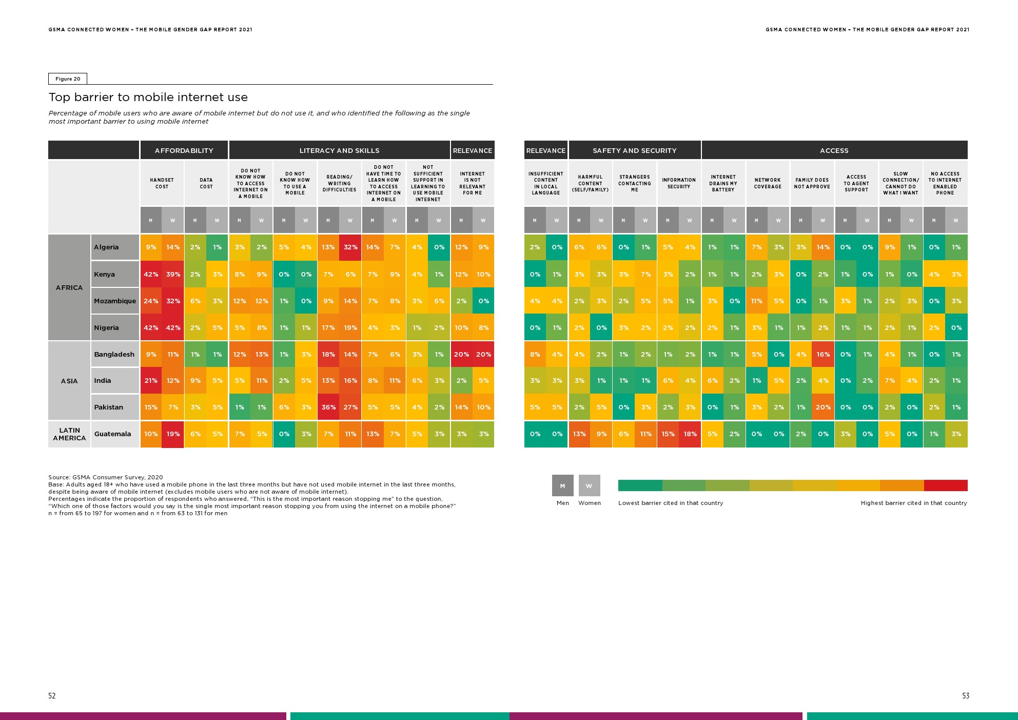 负担能力、识字能力和数字技能的缺乏以及对移动互联网的认知度是女性面临的关键和常见障碍。社会结构性不平等和歧视性社会规范也是一个挑战。即使女性的教育、收入、文化程度和就业水平与男子相同,她们拥有手机或使用移动互联网的可能性仍然较小。