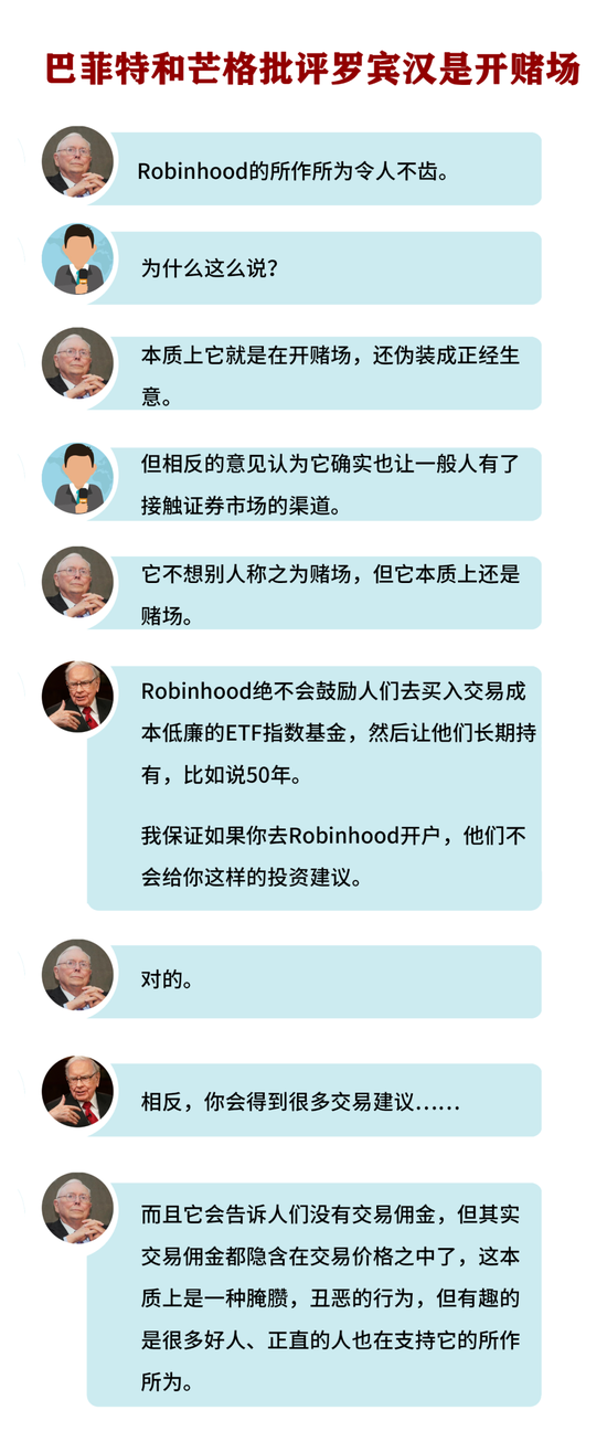 有人批评罗宾汉创造了一个非常有趣、令人兴奋的合法赌场,小到可以放在人们的口袋里。巴菲特97岁的商业伙伴查理·芒格 (Charlie Munger)批评了该公司在鼓励没经验的人疯狂日间交易:“我们允许它存在是疯了。”