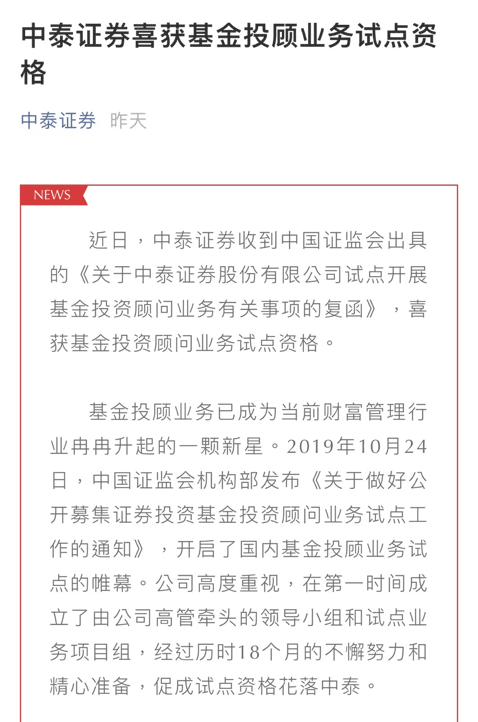 据中泰证券介绍,2019年10月公司第一时间成立了由高管牵头的领导小组和试点业务项目组,历时18个月获得此资格。