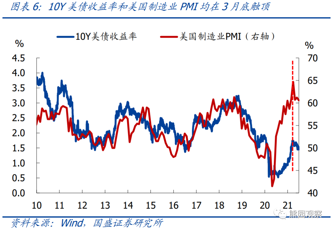 3、近期美债收益率回落,主因是美国经济边际放缓,辅助因素是通胀接近触顶、流动性过剩。