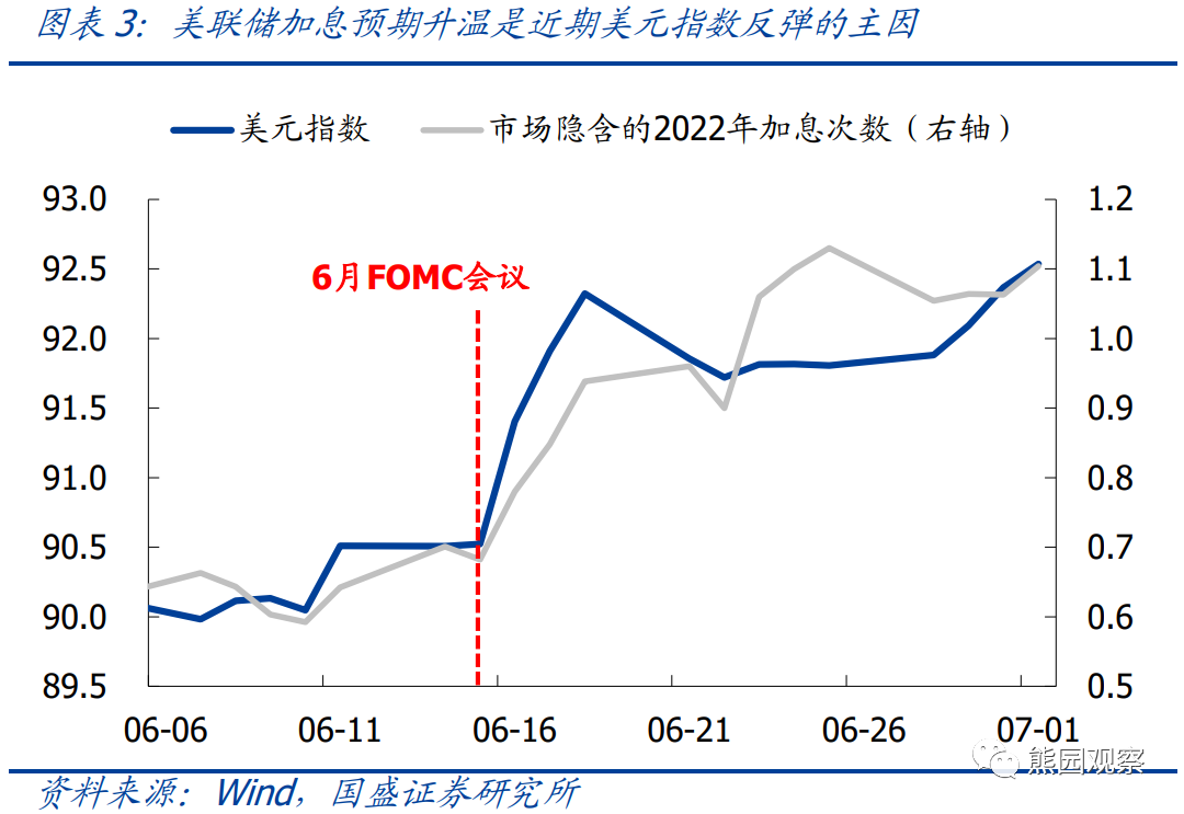 >美联储加息预期升温是主因:6月17日的FOMC会议后,由于美联储点阵图反映的加息次数明显增加,并且对通胀的预测大幅上调,联邦基金利率期货隐含的2022加息次数由0.6次快速提升至1.1次,美元指数也随之反弹。