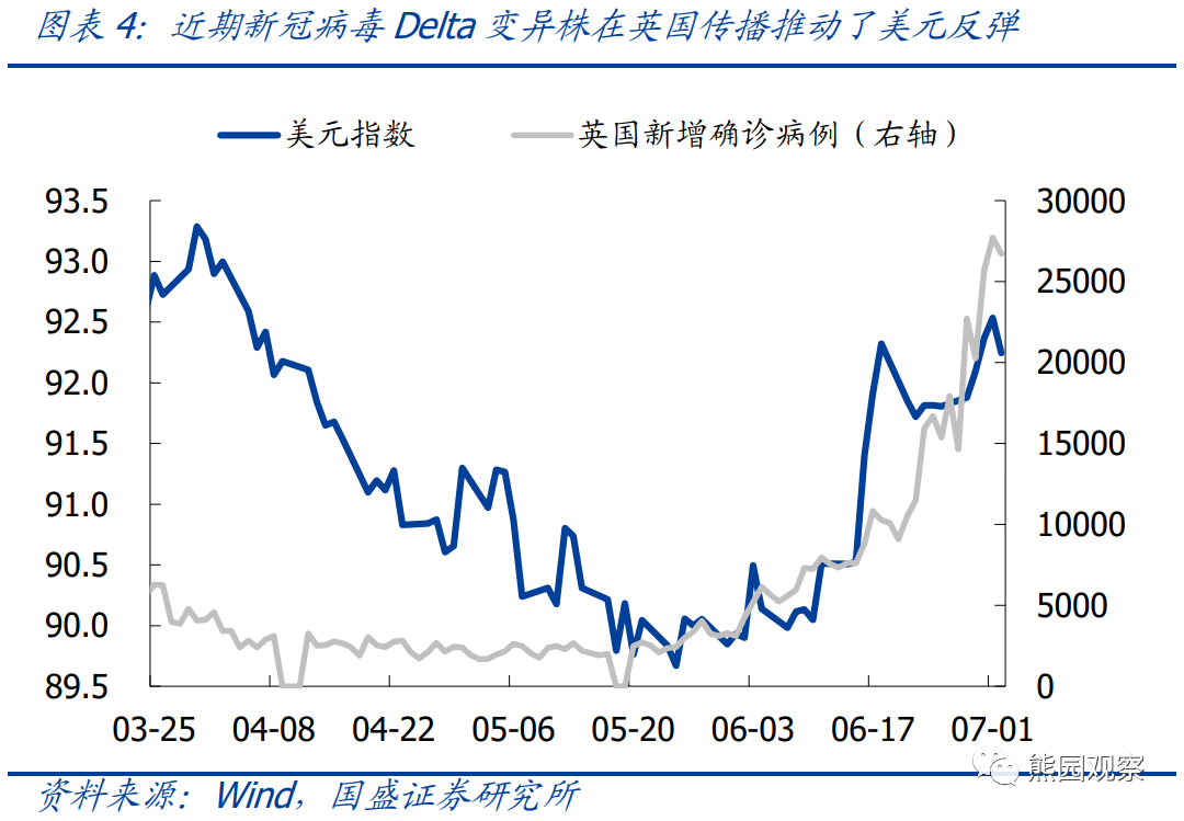 >变异新冠病毒在海外传播是辅助因素:6月以来,新冠病毒Delta变异株在全球多个国家快速传播,受此影响,英国新增确诊病例快速飙升,并将封锁措施延长四周。对全球疫情的担忧加剧引发避险情绪升温,也在一定程度上推高了美元。