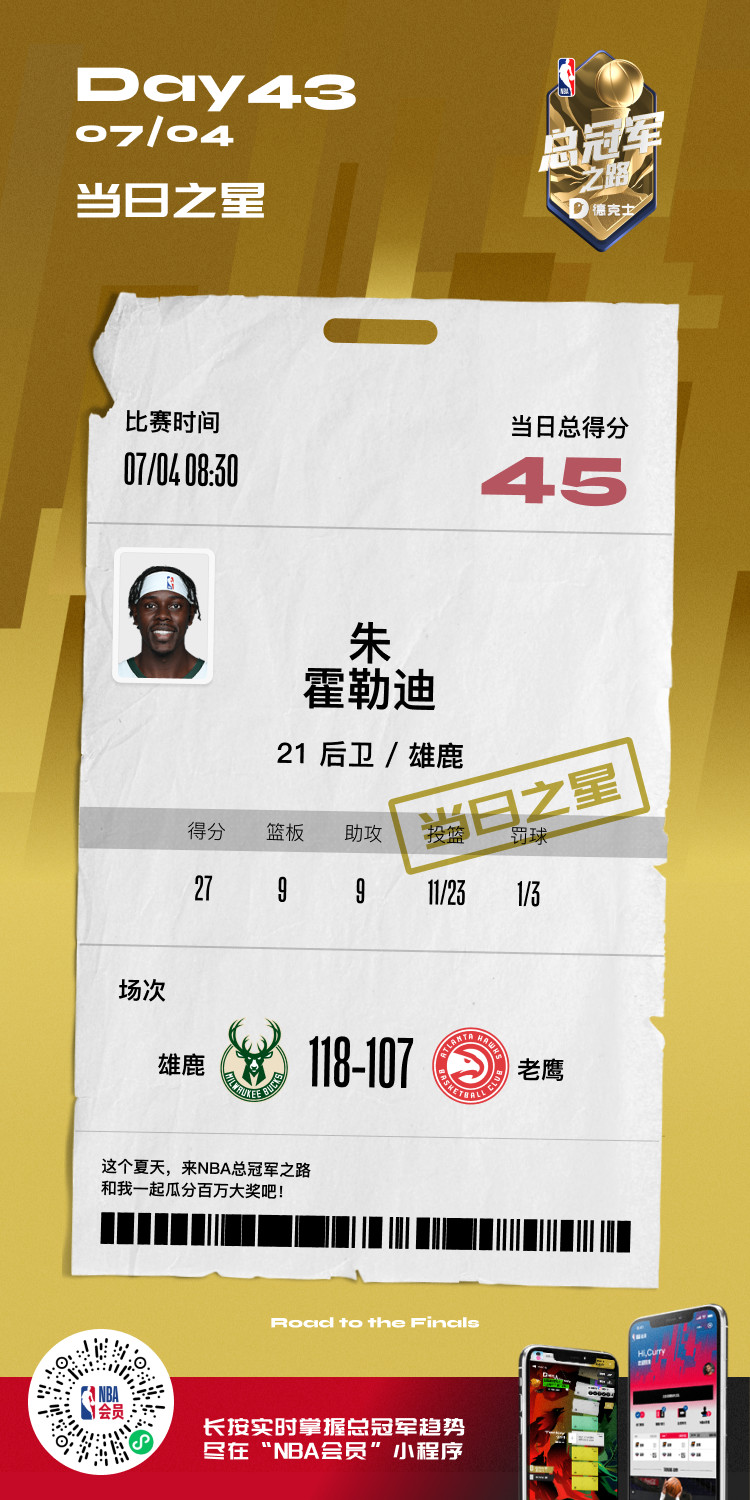 朱-霍勒迪今天得到27分9篮板9助攻,三项数据总和达到45,当选“NBA总冠军之路”的当日之星。参与“NBA会员”微信小程序推出的竞猜活动“NBA总冠军之路”,体验竞猜乐趣,瓜分百万奖金。