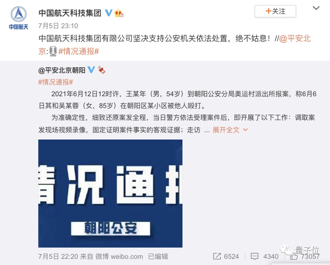 7月6日,也就是今天,中国航天科技集团再次声明:坚决支持公安机关依法处置,绝不姑息!