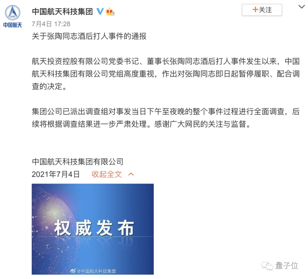 7月4日,中国航天科技集团有限公司发布通报称,对张陶作出即日起暂停履职、配合调查的决定。