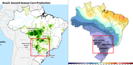 上周发生在巴西西南部帕拉州(Parana)、南马托格罗索州(Mato Grosso do Sul)、圣保罗州(Sao Paulo)以及巴拉圭(Paraguay)的三天霜冻,导致玉米产量预测降低。
