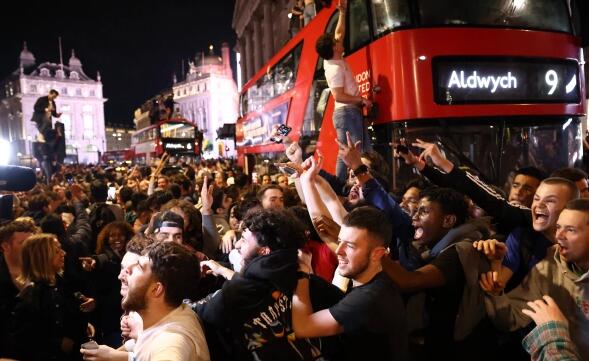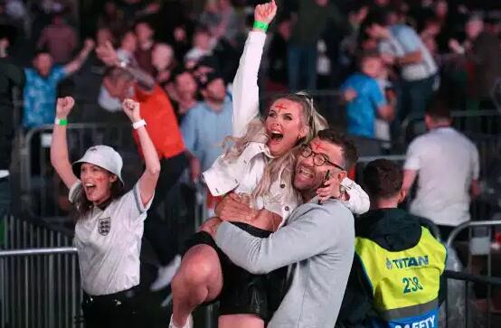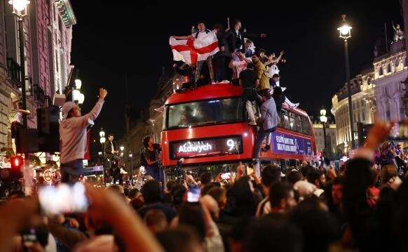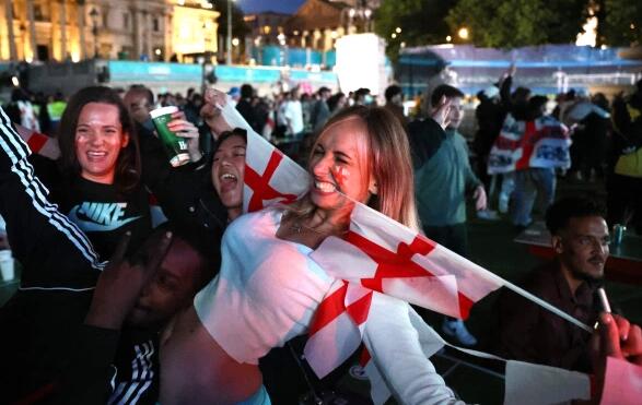 英格兰淘汰丹麦,三狮军团球迷在伦敦狂欢庆祝,纪念这一历史性时刻。