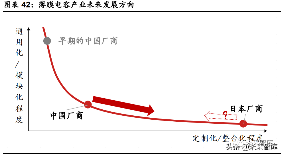 为了更好满足个体客户的需求,我们认为薄膜电容企业目前已经完成了内 部的模块化,并实现了交付产品的高度整合化。通用化产品常常因为其通用性 而具有较高的模块化程度、但整合化程度较低。另一方面,在混合动力车应用 领域,企业内模块化程度低于通用化产品(为满足客户需求),但对外整合化程 度则较高。因此,如果企业能提高内部模块化程度及对外整合化程度,或将有 助于实现产品降价及性能提高,提高产品竞争力。相对的,对外整合化较低的 产品或面临较激烈的价格竞争。