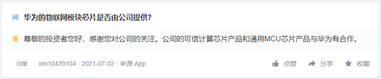 国民技术也是如此。据公开资料显示,公司7月2日公开在深交所互动易上表示,“公司的可信计算芯片产品和通用MCU芯片产品与华为有合作(见图3)。”但据国民技术今年一季度报显示,公司实现净利润为-0.16亿元,同比下滑-38.31%,即使是以去年全年公司的净利润表现作为对比,国民技术虽然有所盈利,但其净利润同样同比下滑较大,达89.19%。