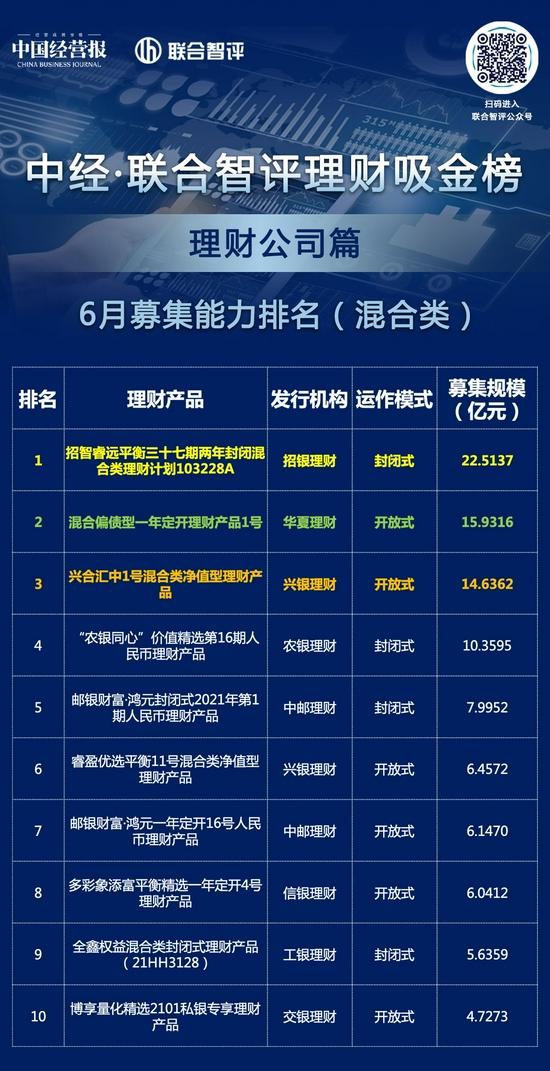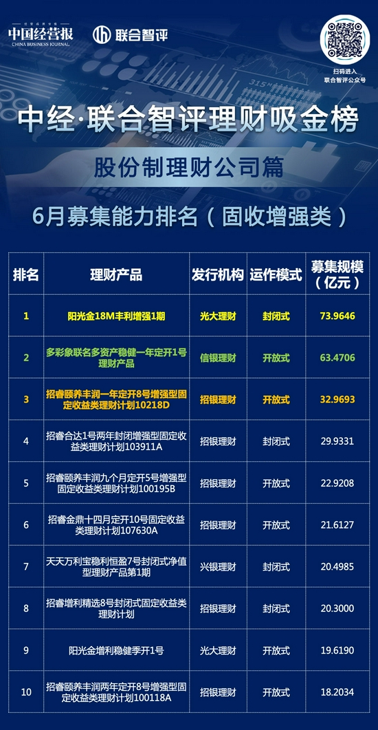 由《中国经营报》与联合智评共同推出的6月“中经·联合智评理财吸金榜”分别对固收增强类产品和混合类产品的募集能力进行排名。