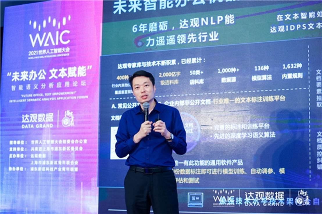 7月10日,国内AI领军企业达观数据携手浦东青年联合会联合主办了世界人工智能大会“未来办公,文本赋能”主题论坛,围绕智能办公机器人的发展应用和众多人工智能大咖探讨了前沿技术及产业未来,呈现了一场精彩的语义分析交流盛宴。