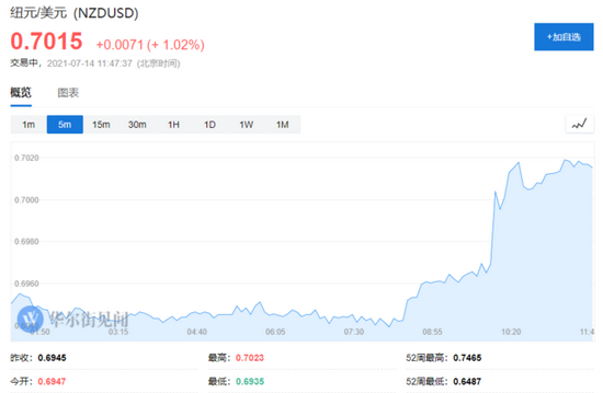 目前,纽元兑美元NZD/USD日内涨幅扩大至1.02%,报0.7015。