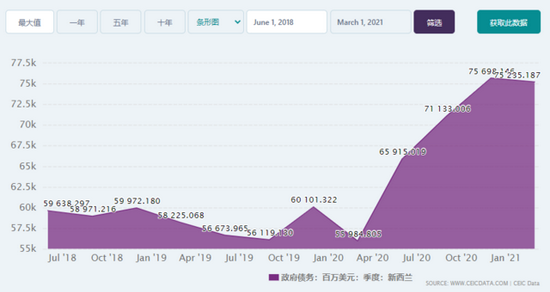 据全球宏观经济数据统计网站CEIC,截至今年3月,新西兰国家政府债务增长超34%。