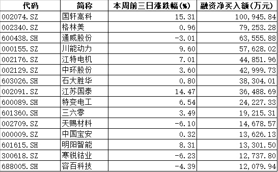 根据交易所公布的数据,本周前三个交易日,国轩高科、格林美、通威股份3只新能源股票分别获融资资金净买入10.09亿元、7.93亿元和6.36亿元,居所有两融标的股前三位。此外,融捷股份、石大胜华、江苏国泰等同期融资净买入额均超3亿元,显示融资客仍在高位加码新能源板块。