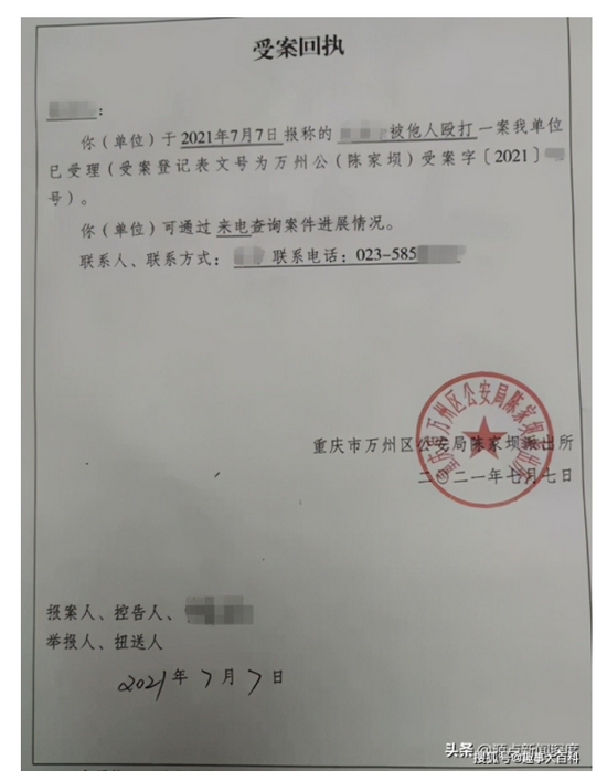 重庆市万州区公安局陈家坝派出所的一份受案回执称,7月7日报称的薛邮被他人殴打一案,“我单位已受理。”