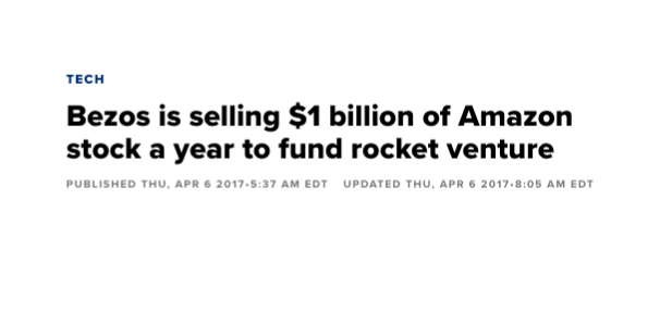 2017年4月,贝索斯宣布他将每年出售10亿美元的股票,以资助蓝色起源。