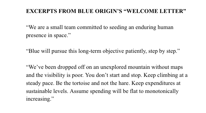他将这一理念写入了所有蓝色起源员工收到的「欢迎信」中。
