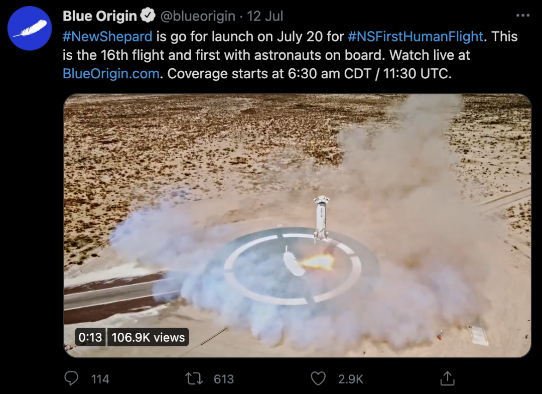 同时,在7月20日,蓝色起源也将直播这次发射。
