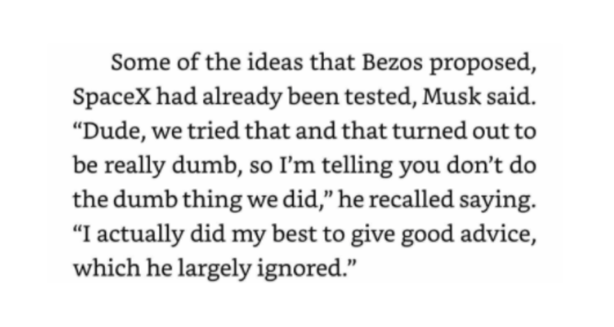贝索斯试图向马斯克输出一些自己的想法,得到的回复却是:「朋友,我们早就试过了。」