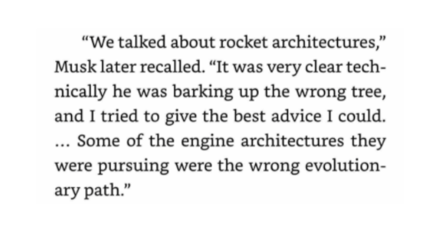 马斯克在之后回忆到:「我们谈到了火箭的架构,从技术上讲,贝索斯完全把『科技树』点歪了。」