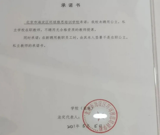随着线下停课、课程规范、罚款等措施执行 ,层层监管下线下教育机构也逐渐规范化发展。走进环球雅思海淀校区,可以看到很多公示,其中包括聘用教师的承诺书。对聘用教师的限制,在一定程度上规避了学校教师引导学生报名课外辅导班,而弱化正式校园课堂的知识传授作用。这也是今年相关部门监管线下教育机构的重点方面之一。