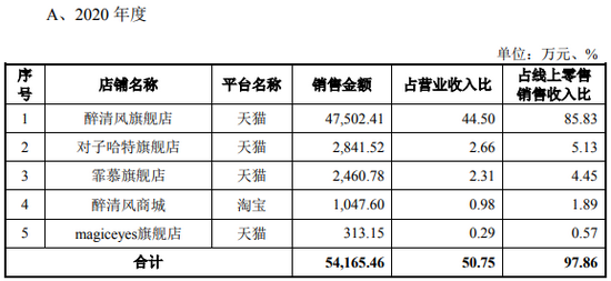 富凯IPO财经关注到,醉清风的主要销售渠道是阿里旗下的天猫商城,通过多个店铺进行销售,其中收入近一半的份额来自于天猫商城的醉清风旗舰店,由此推断公司的刷单主要集中在天猫商城上。