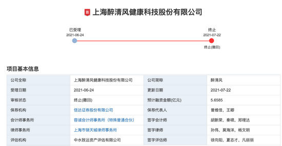 7月22日深交所官网发布《关于终止对上海醉清风健康科技股份有限公司首次公开发行股票并在创业板上市审核的决定》依法受理醉清风终止上市审核。