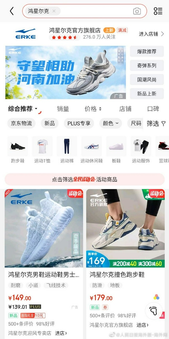 【国潮运动品牌爆发!鸿星尔克单日销售额增长超52倍】京东平台数据显示,主题为“全民运动会”的线上运动购物场景开启,与全民运动热情高涨同步,国潮运动品牌也迎来了销售的全面爆发,22日、23日两天整体销售额同比增长超280%。跑步鞋、篮球鞋、运动裤、T恤等成为销量最高的品类,鸿星尔克、安踏、361度、匹克等国潮运动品牌销售暴涨,位居销售规模前列。值得注意的是,国潮品牌鸿星尔克23日当日销售额同比增长超52倍。