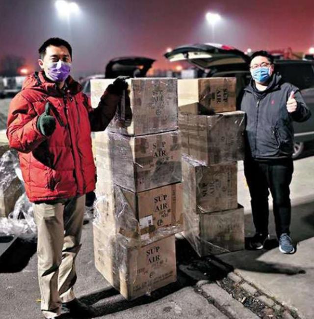 王柏荣(右)凌晨在顺义机场接收抗疫物资