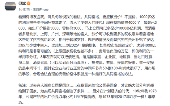 但斌称,共同富裕,更应该提价!不提价,1000多亿的利润被各类中间环节拿走了,流入了少数人的腰包!现在整箱价格4000了,散装已3000。如出厂价提到3000,零售价3600,马上公司可以多至少1000多亿利润。