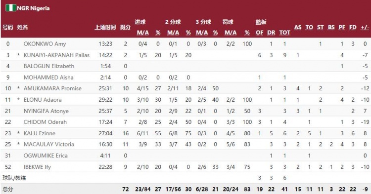 尼日利亚这边,全队4人得分上双,卡鲁拿到16分6篮板2助攻1抢断。