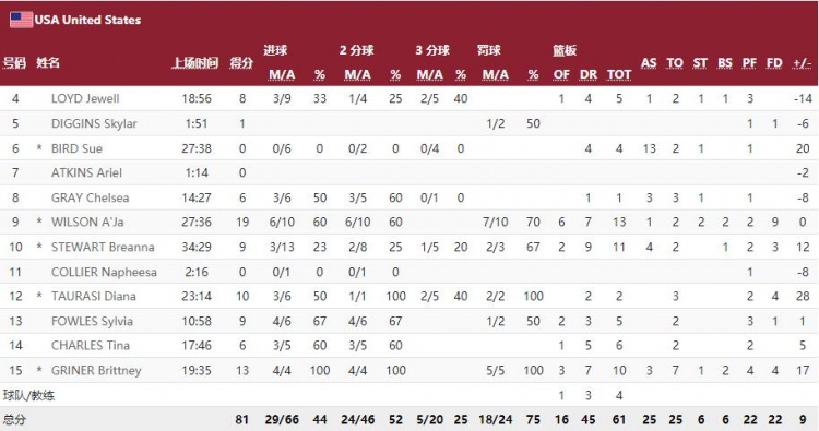 此役,美国女篮阿佳-威尔逊砍下19分13篮板1助攻2抢断2盖帽,老将陶乐西得到10分2篮板,格里娜拿下13分10篮板3助攻1抢断2盖帽,斯图尔特得到9分11篮板4助攻,苏-伯德6中0得分挂零。