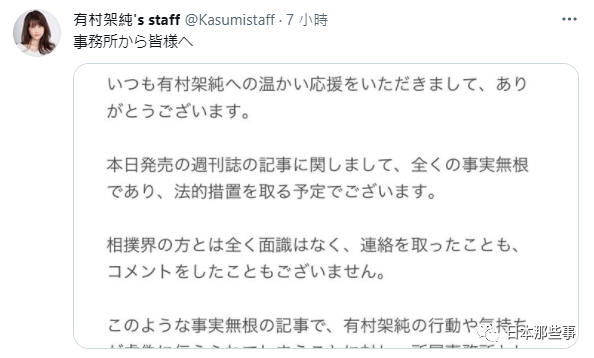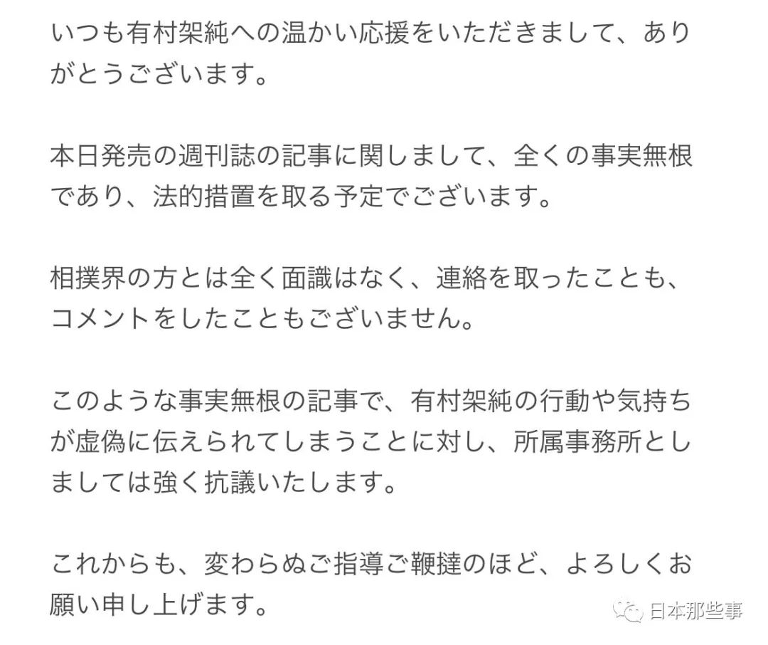 事务所表示《女自》这篇新闻根本就是胡编乱造,他们将会采取法律措施,有村架纯并不认识任何相扑界的人士,也完全没有联系过他们,更没有对他们进行过评论。事务所对这样胡诌的新闻表示抗议。