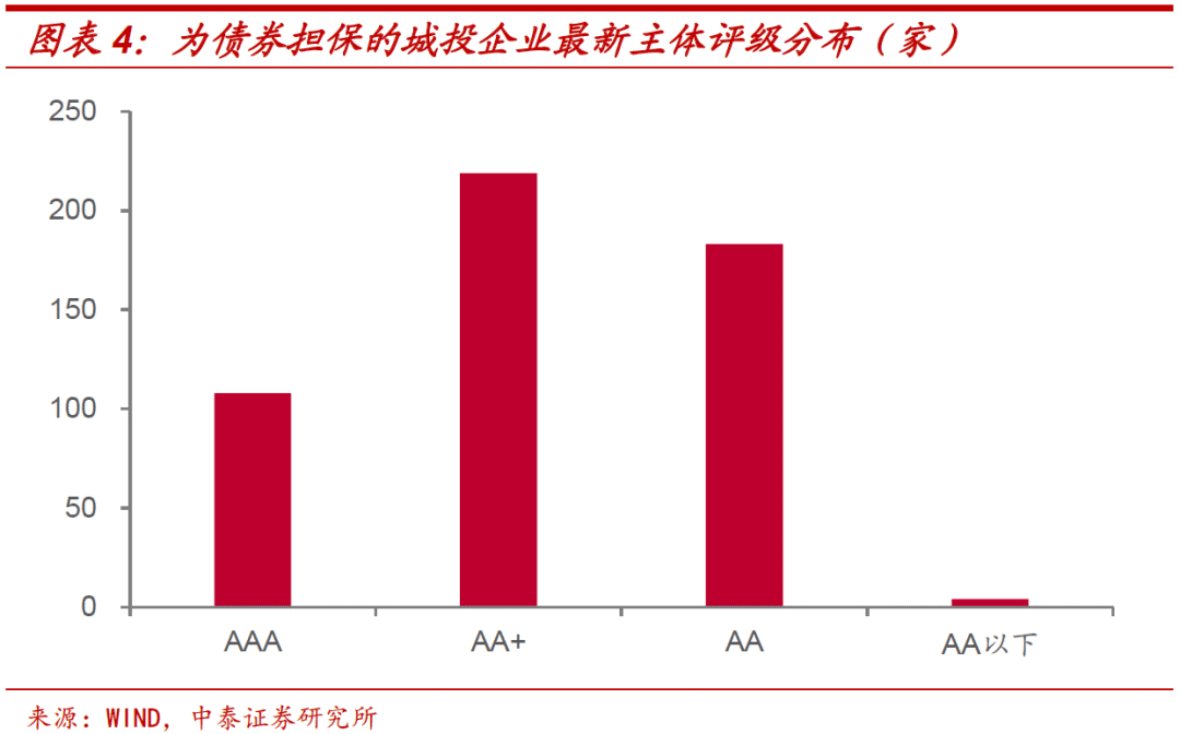为债券担保的城投企业中,截至2021年7月20日,AAA评级的有108家,AA+级有220家,AA级有182家,主体评级以中低等级为主。