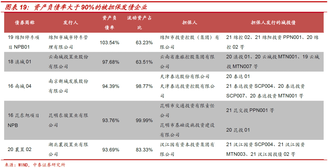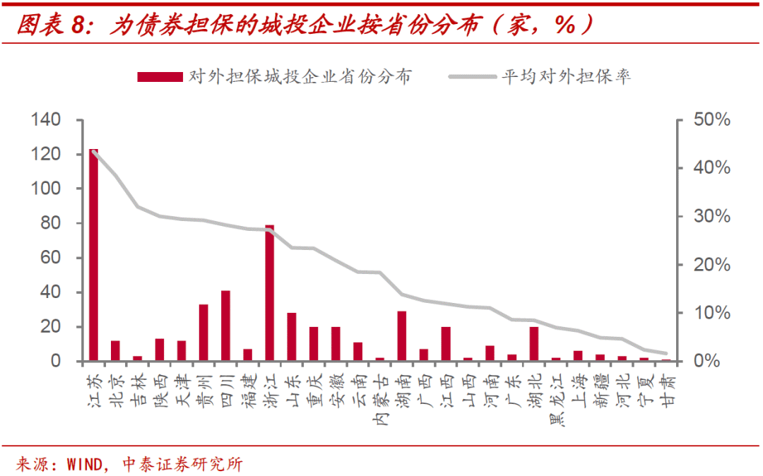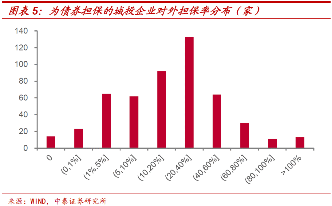在为债券担保的城投企业中,有14家企业对外担保率为0,但这些企业均有对外担保债券,可能被担保债券的发行人为担保企业的全资或控股子公司。118家城投企业对外担保率大于40%;24家对外担保率大于80%;13家大于100%。